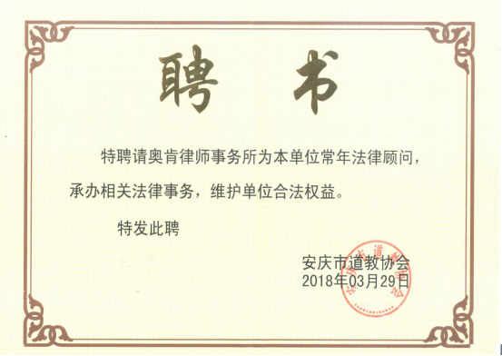 2018年3月29日,经安庆市道教协会办公室会议集体讨论,决定聘请奥肯律师事务所为常年法律顾问。随着奥肯律师事务所吕品律师和安庆市道教协会会长李奕木签字仪式的完成,奥肯律师事务所成为该协会指定的唯一法律顾问单位。