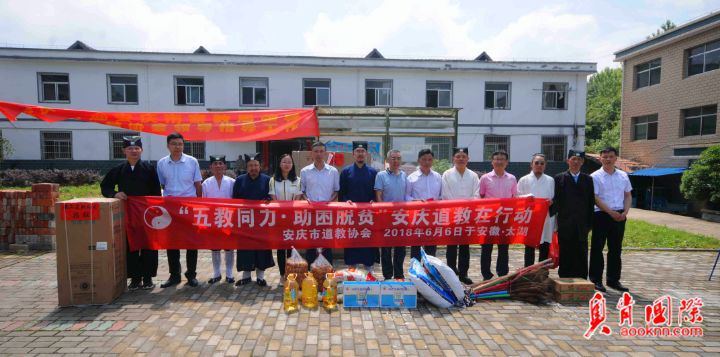 2018年6月6日,安徽省安庆市道教协会组织了“五教同力·助困脱贫”活动。安庆市宗教局副局长方祥、安庆市道教协会会长李奕木、奥肯律师事务所律师吕品等一行十余人,前往安徽省安庆市太湖县城西乡,先后到太湖县城西乡树林小学、城西乡敬老院、军烈属家庭和贫困户家庭开展以“助困脱贫•回馈社会”为主题的爱心捐赠活动,共送去价值约4万元的书籍、文体用品、消毒柜、冰箱、米、油、肥皂、洗衣粉等慰问品以及慰问金。太湖县民宗局、城西乡人民政府、太湖县道教协会主要负责同志陪同。