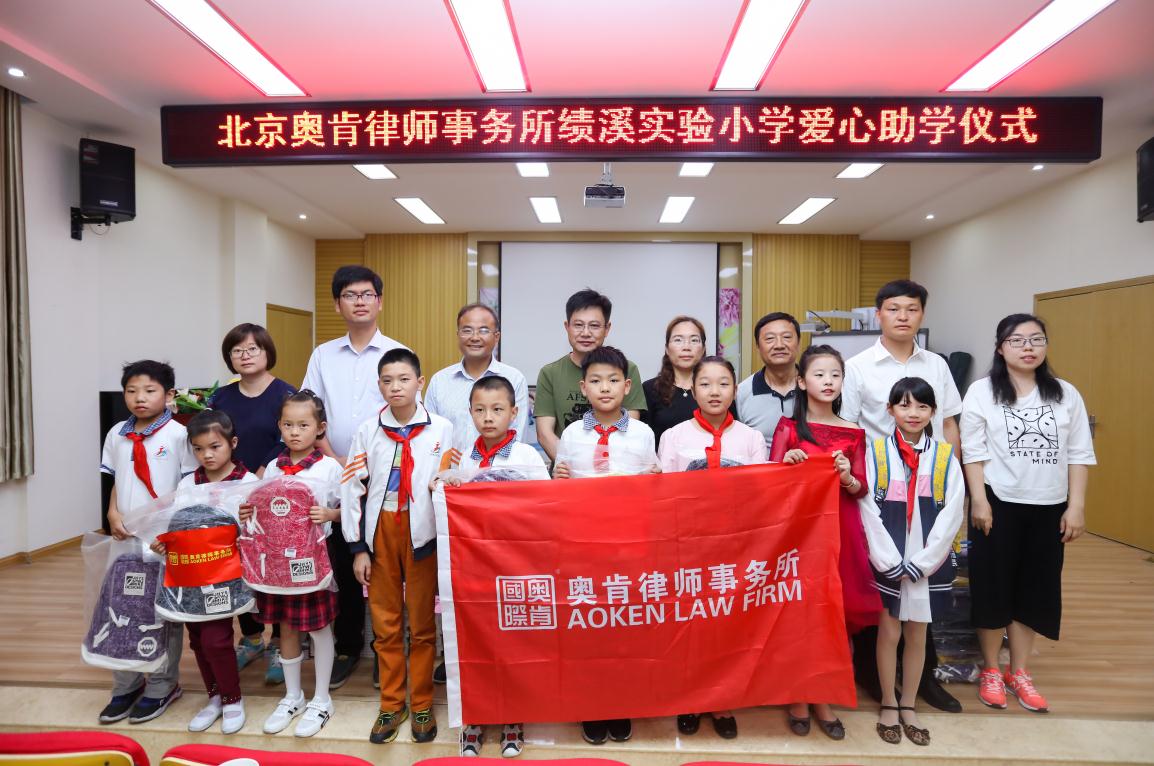 2019年6月17日,奥肯律师事务所赴安徽省宣城市绩溪县绩溪实验小学开展爱心助学活动。乘着夏日的细雨,法制日报社《法制与新闻》杂志副总编韦文洁、奥肯律师事务所律师何鎏、奥肯律师事务所执行主任李传文一行到达绩溪实验小学,为同学们送去一份温暖、一份关爱。绩溪实验小学黄勇校长携师生代表对奥肯律师事务所一行进行了热情的接待。