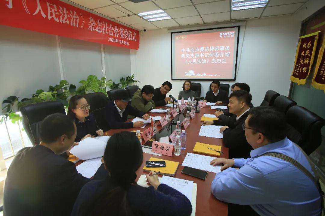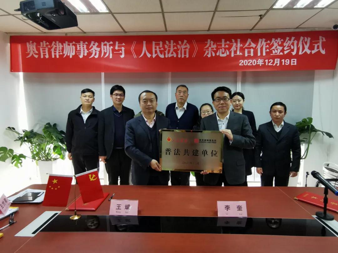 20201219日,奥肯律师事务所与国内知名法治媒体《人民法治》杂志社达成普法共建合作。此次普法共建合作,旨在加强律媒法治共建工作,共同助力中国法治建设。法治日报社、《法制与新闻》杂志执行副总编韦文洁,《人民法治》杂志社人民法治研究院负责人李奎,中国商报社战略部主任王竹君,发现良品网主编孙海宁,北京奥肯律师事务所党支部书记何鎏律师,原中国青年政治学院教授、奥肯律师事务所律师张漫儒,专利部主任、执行副主任王斌,律师郭建萍,执行主任李传文出席了签约活动。签约仪式由奥肯律师事务所执行副主任朱先雄主持。