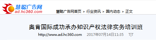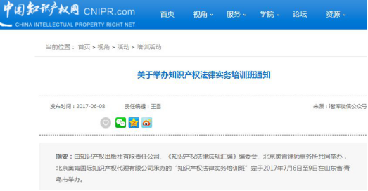 2017年7月6日至9日,由知识产权出版社有限责任公司、《知识产权法律法规汇编》编委会、奥肯律师事务所共同主办,奥肯国际知识产权代理有限公司承办的“知识产权法律实务培训班”在山东青岛举行,来自全国各地的商标代理机构、专利代理机构、版权代理机构、律师事务所、知名企业等机构的相关负责人100余人参加培训班。此次培训活动由知识产权出版社有限责任公司培训中心马永涛、奥肯律师事务所主任律师王德春共同主持。