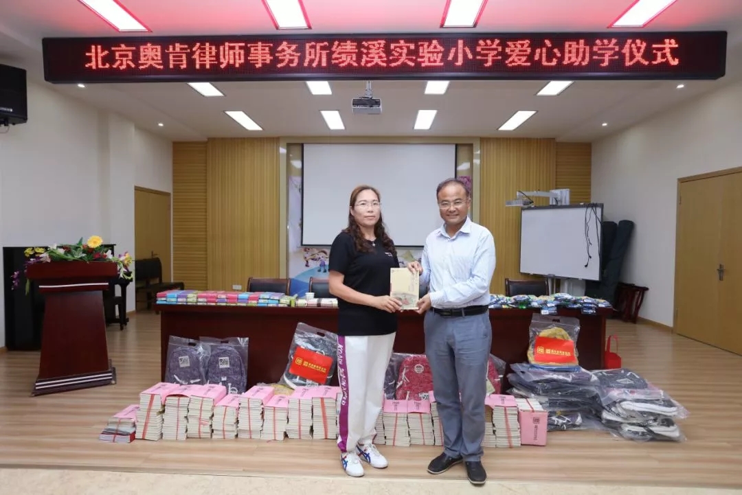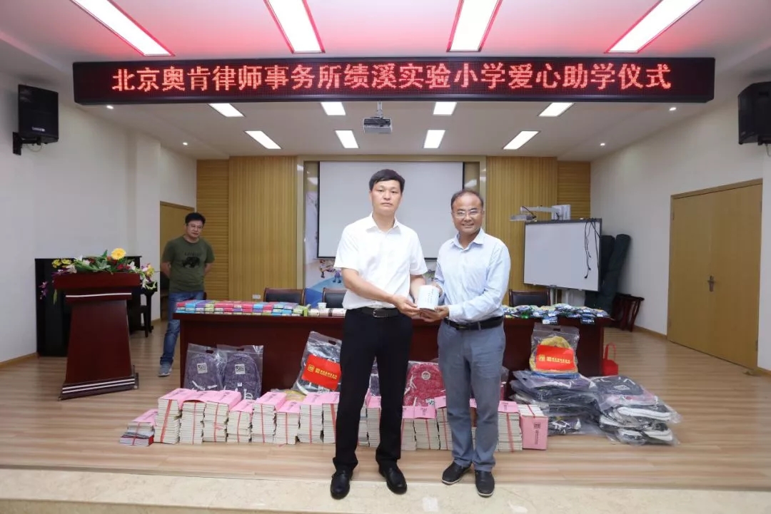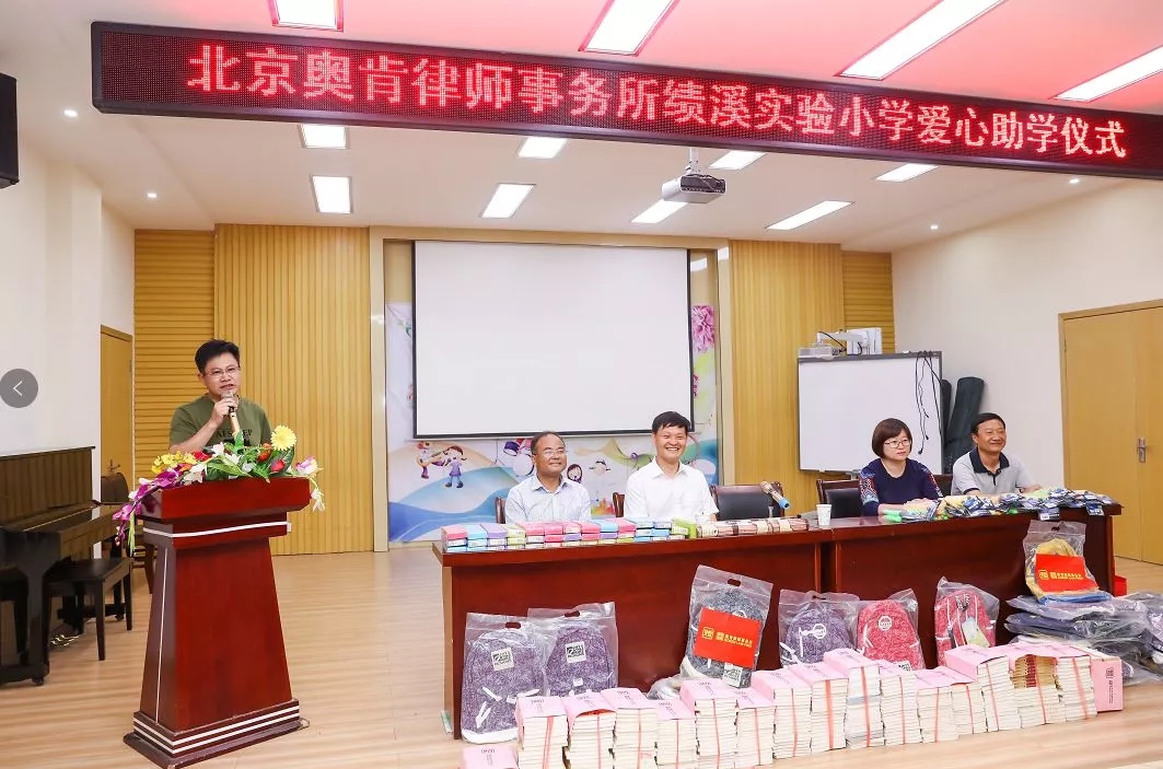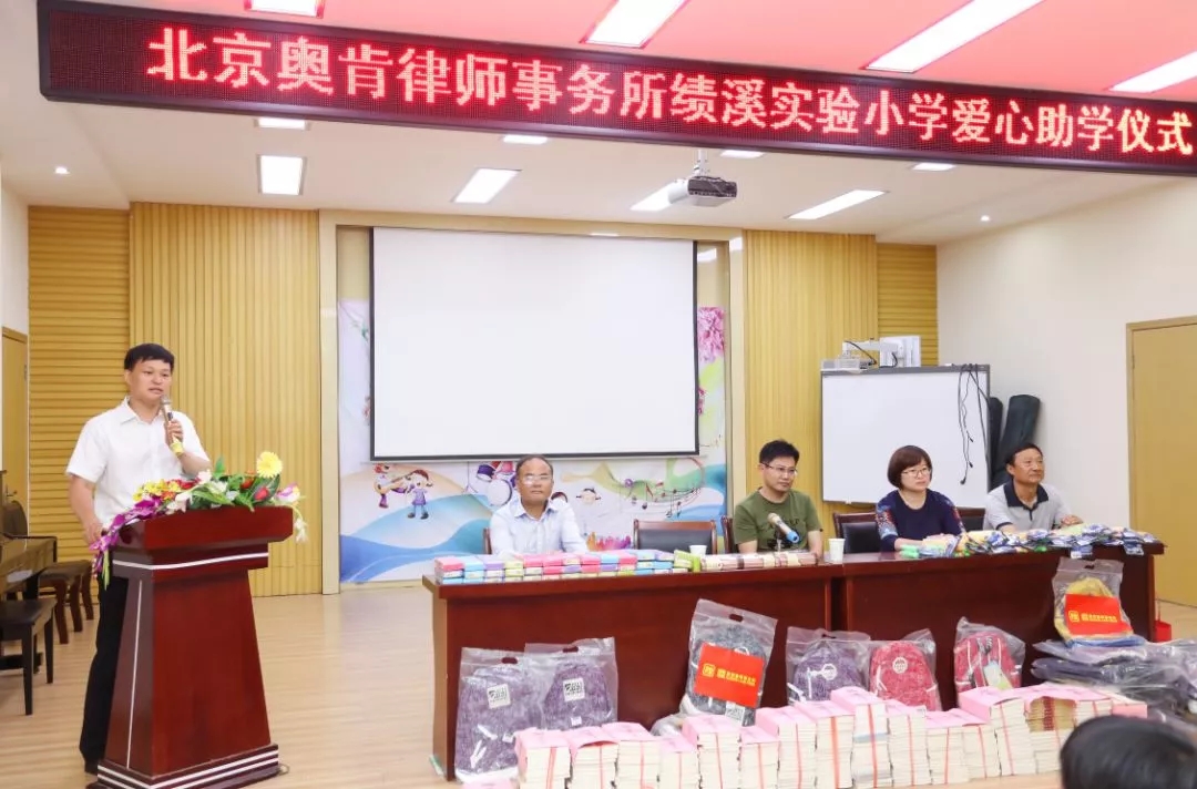 首先,黄勇校长对远道而来爱心助学的各位嘉宾表示了热烈的欢迎和衷心的感谢。绩溪实验小学自1908年创办以来,百年沧桑,教风长存,文脉相传,从创办之初的“私立胡氏初等小学堂”发展成为现阶段绩溪县规模最大的小学。此次奥肯律师事务所秉承社会责任,为绩溪实验小学的贫困学生捐赠了各类书籍、书包、文具、跳绳等文体用品,给孩子们带来物质和精神上的双重支持。