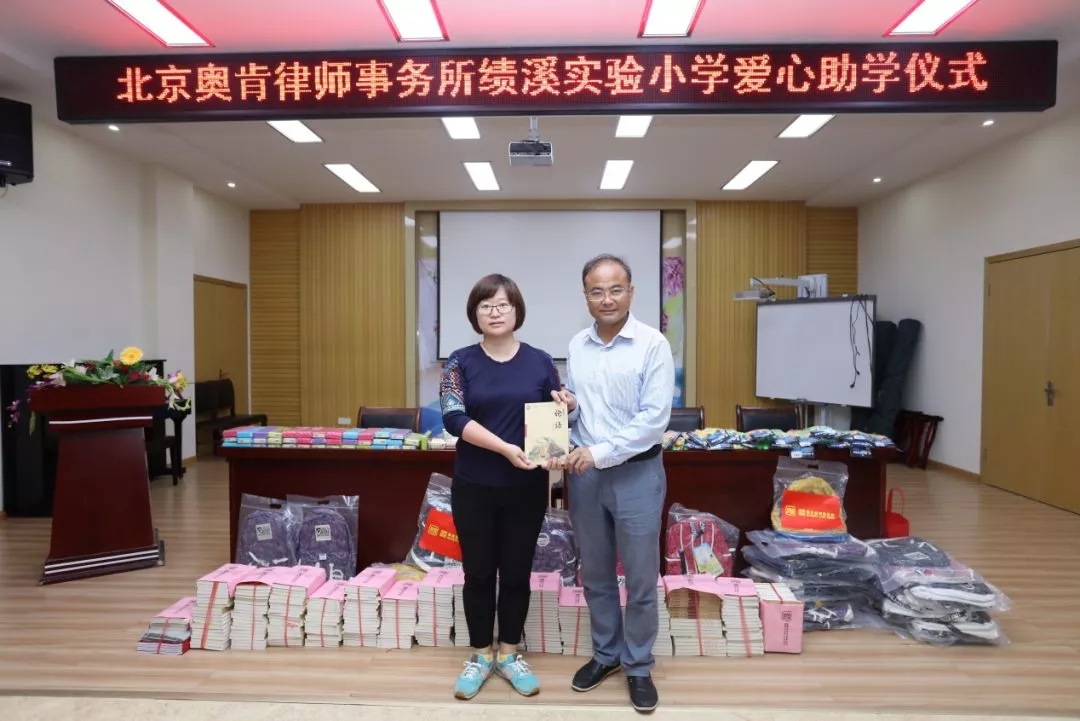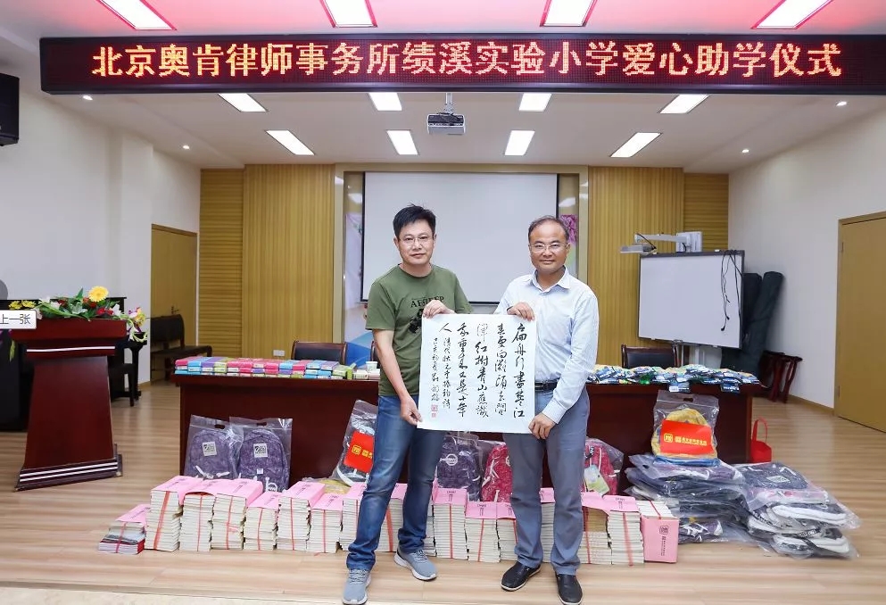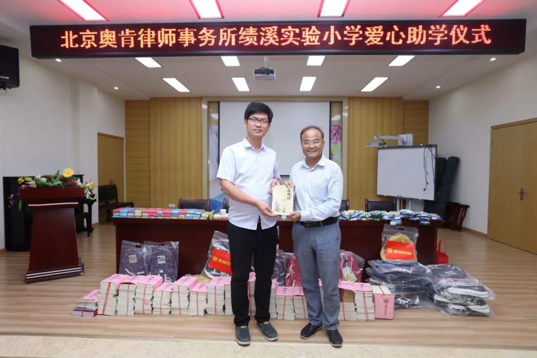 接下来,奥肯律师事务所执行主任李传文代表奥肯律师事务所发言。作为一家专业综合的法律服务机构,奥肯律师事务所一直秉承“肯于学习、肯于进取、肯于担当”的精神,为客户提供专业、优质、高效的法律服务。同时奥肯律师事务所始终不忘初心,一直致力于社会公益事业,多次开展助困脱贫、捐资助学活动。这次来到绩溪,也希望在力所能及的范围之内,尽可能地为孩子们带来更多的关爱。为此精选经典国学书籍《唐诗三百首》、《论语》、《道德经》,赠送给同学们,祝愿大家徜徉在知识的海洋中,感受到国学的经典,感悟传统文化的博大精深,并在学习中不断成长,在成长中不忘学习。