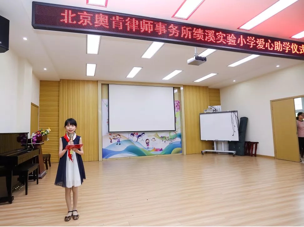 接下来,绩溪实验小学学生代表上台发言,对奥肯律师事务所的叔叔阿姨们表示崇高的敬意和衷心的感谢,并号召同学们以实际行动来表示感谢,今后会更加努力奋斗,好好学习,不辜负大家的期望和帮助。