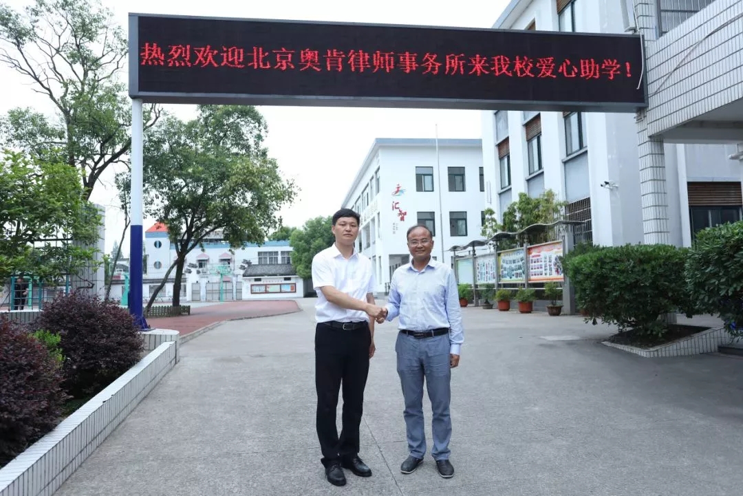 2019年6月17日,奥肯律师事务所赴安徽省宣城市绩溪县绩溪实验小学开展爱心助学活动。乘着夏日的细雨,法制日报社《法制与新闻》杂志副总编韦文洁、奥肯律师事务所律师何鎏、奥肯律师事务所执行主任李传文一行到达绩溪实验小学,为同学们送去一份温暖、一份关爱。绩溪实验小学黄勇校长携师生代表对奥肯律师事务所一行进行了热情的接待。
